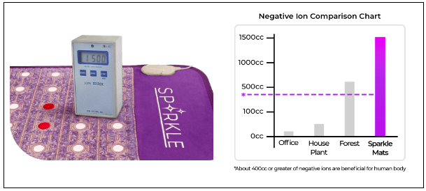 Both the Sparkle Mat and the amethyst BioMat heat amethyst and tourmaline stones to create over 1,500+ negative ions per square inch to achieve the benefits of negative ions and offset the positive-ion disruption we are bombarded with.