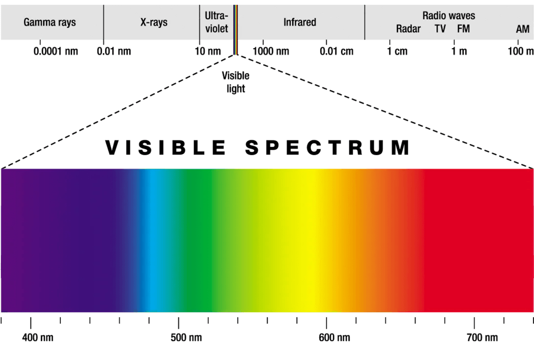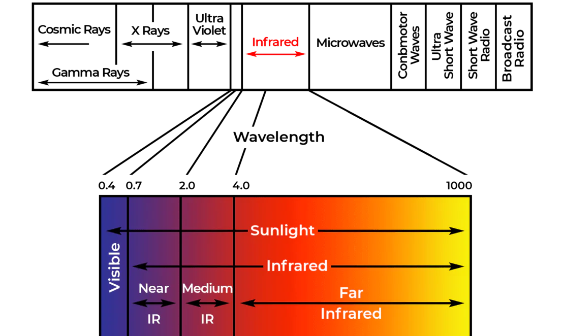 To make this concept simple to comprehend, the word “infrared” means “below red,” as these waves are just below those of visible red light (see the light wavelength graphic below.)11